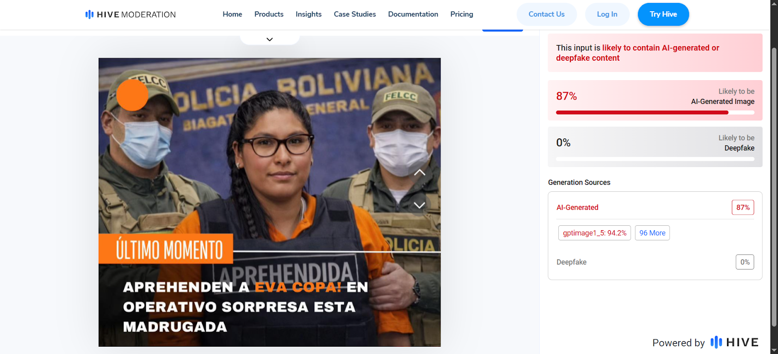 ChequeaBolivia verificó el caso con la herramienta Hive Moderation, una herramienta especializada en detección de contenido generado o manipulado con IA. La misma presentó un 87 por ciento de probabilidad de que la primera imagen haya sido generada con IA, 95,7 por ciento de probabilidad para la segunda imagen y 93.4 por ciento de probabilidad para la tercera imagen.