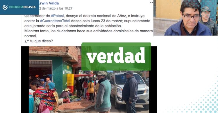 En Facebook se comparten imágenes de personas realizando compras y una en la que aparece el gobernador de Potosí, Omar Véliz, junto a un texto que señala que la cuarentena en ese departamento inició el lunes y no el domingo, como estableció la Presidenta del Estado, Jeanine Áñez. ChequeaBolivia verificó que la información es verdadera.