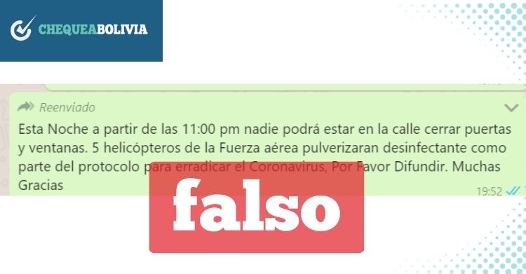 En las redes sociales circula un mensaje que establece que a partir de las 23:00 nadie podrá estar en la calle porque cinco helicópteros de la Fuerza Aérea pulverizarán desinfectante como parte del protocolo para erradicar el coronavirus. ChequeaBolivia constató que se trata de información falsa.