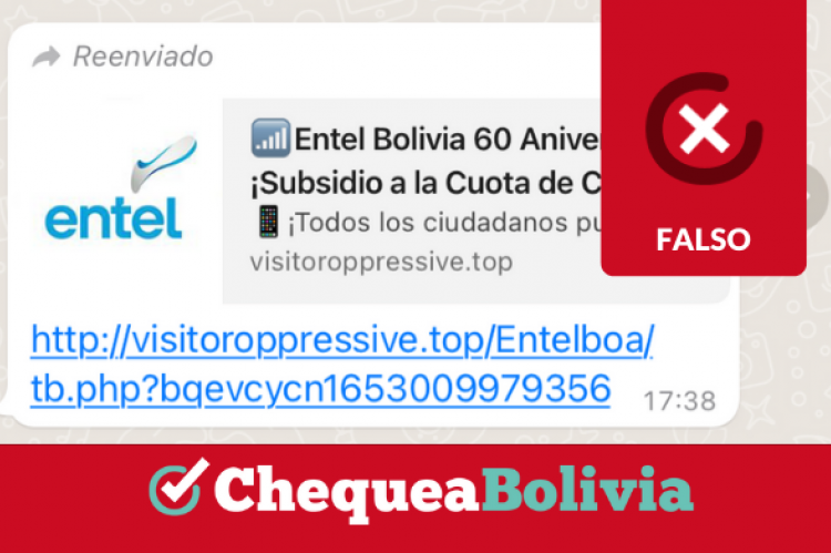 En WhatsApp se reenvía un mensaje con un enlace anunciando un supuesto sorteo de la empresa estatal Entel por su 60 aniversario para ganar de 1.000 bolivianos. ChequeaBolivia verificó que es información falsa.