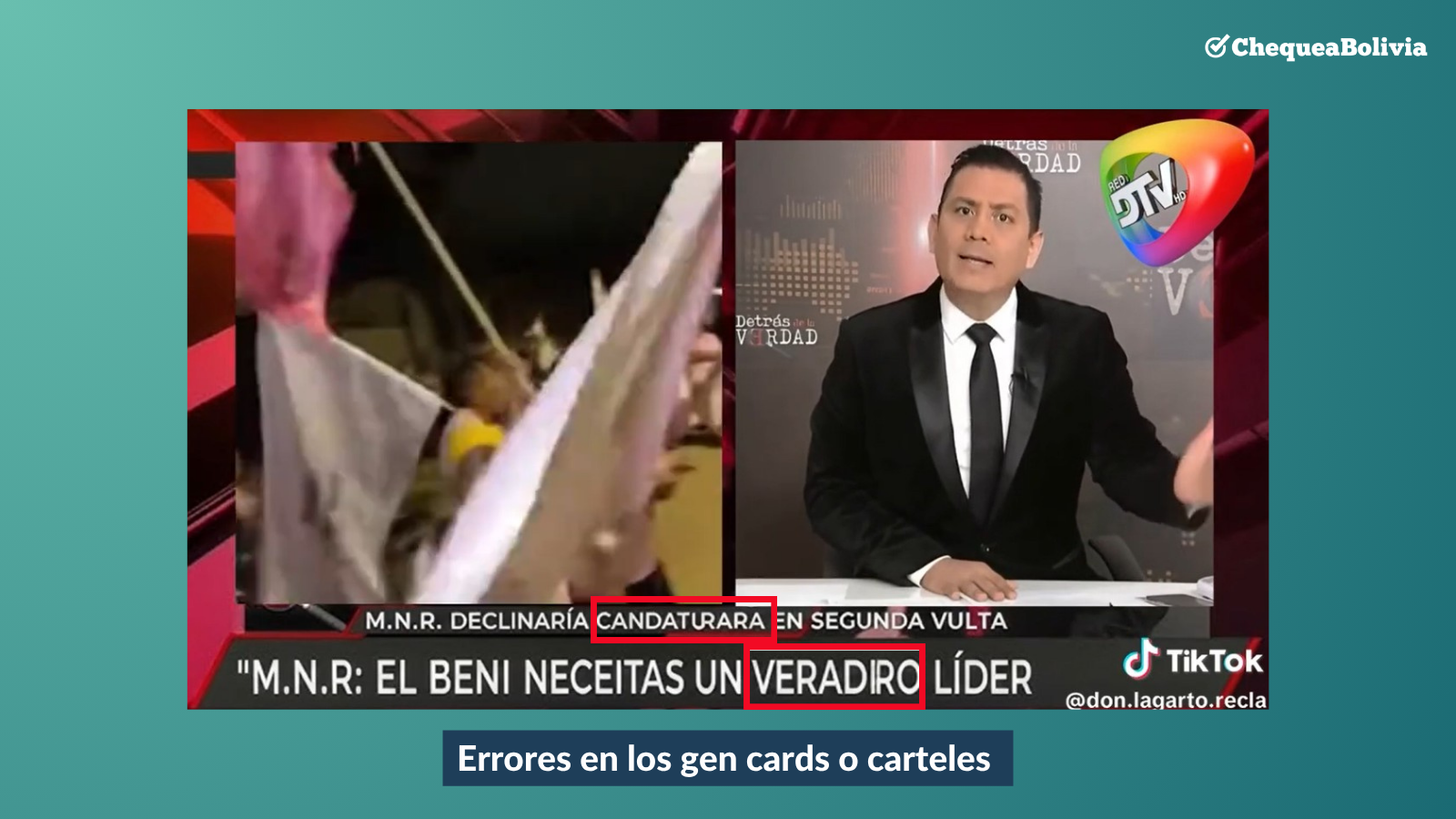 Asimismo, ChequeaBolivia revisó detalladamente el video y comprobó que existen muchos errores en los titulares y los gen cards o carteles que acompañan las imágenes. Por ejemplo se lee: “El Beni necesitas un veradiro líder” y “M.N.R declinaría candaturara en segunda vulta” (sic).
