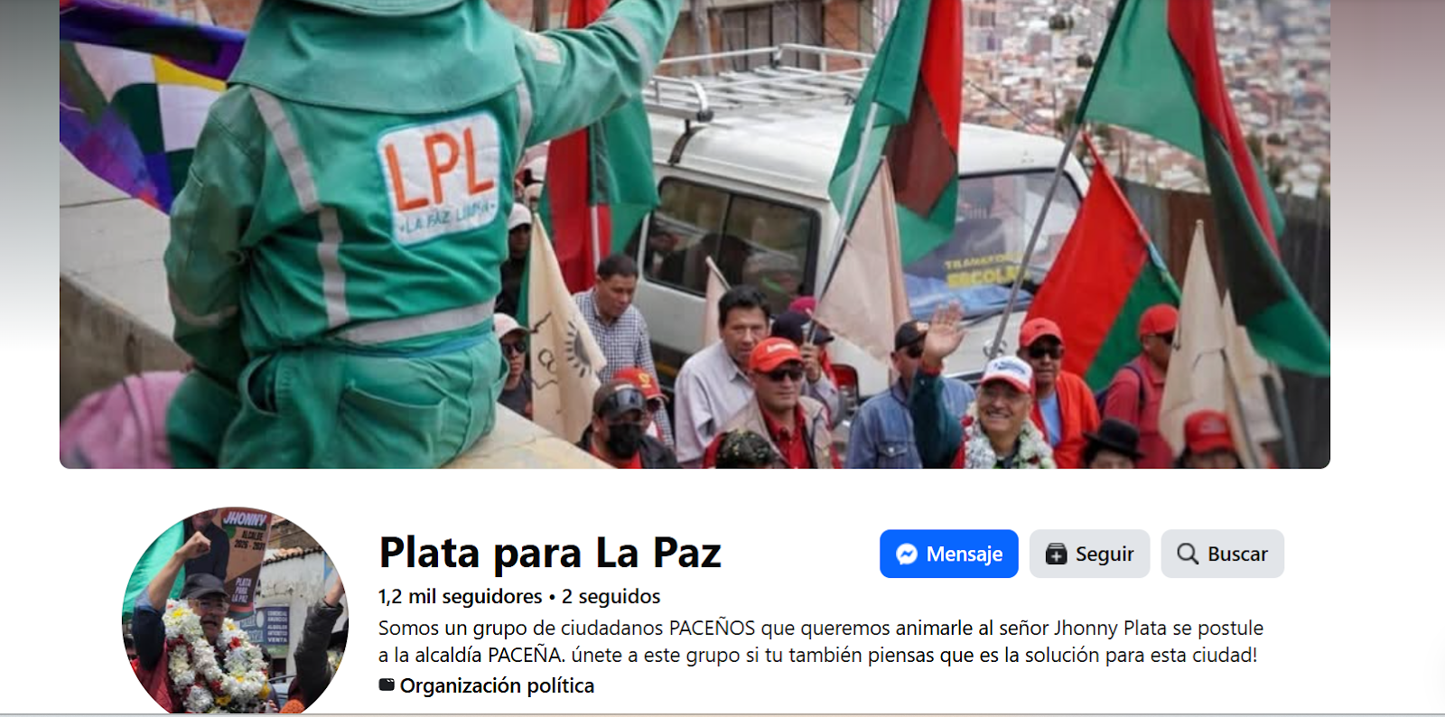 Cabe mencionar que la página de Facebook que realizó la publicación se denomina “Plata para La Paz” y en su descripción señala ser afín al candidato Jhonny Plata.