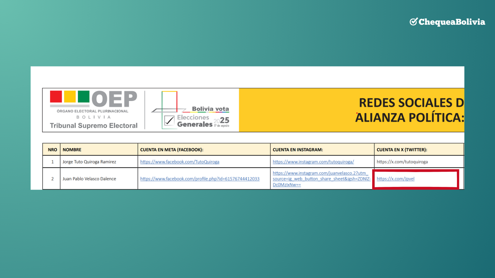 En una revisión de la lista oficial de las redes sociales de los candidatos de la Alianza Libre presentada al Tribunal Supremo Electoral (TSE) se constató que efectivamente era su cuenta oficial, porque lleva el mismo usuario “@Jpvel”.