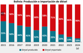 En 2015, se importaba el 45 por ciento del diésel, y este porcentaje aumentó anualmente hasta llegar al 90 por ciento en 2024, lo que significa que nueve de cada diez litros de diésel consumidos en Bolivia son importados.