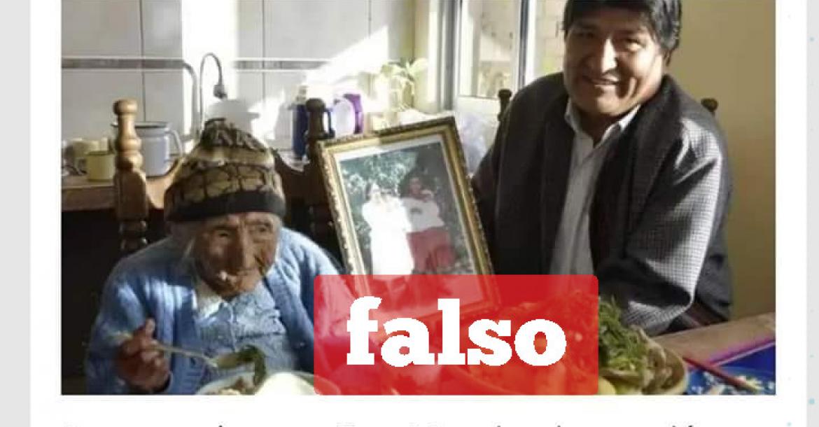 En Facebook se compartió una fotografía del presidente Evo Morales junto a “mamá Julia”, la mujer más longeva de Bolivia. El texto de la imagen señala que pese a que el Presidente le regaló una vivienda, ella le dijo que votará por una nueva opción porque la alternancia es lo más sano de la democracia. ChequeaBolivia verificó que el contenido es falso.