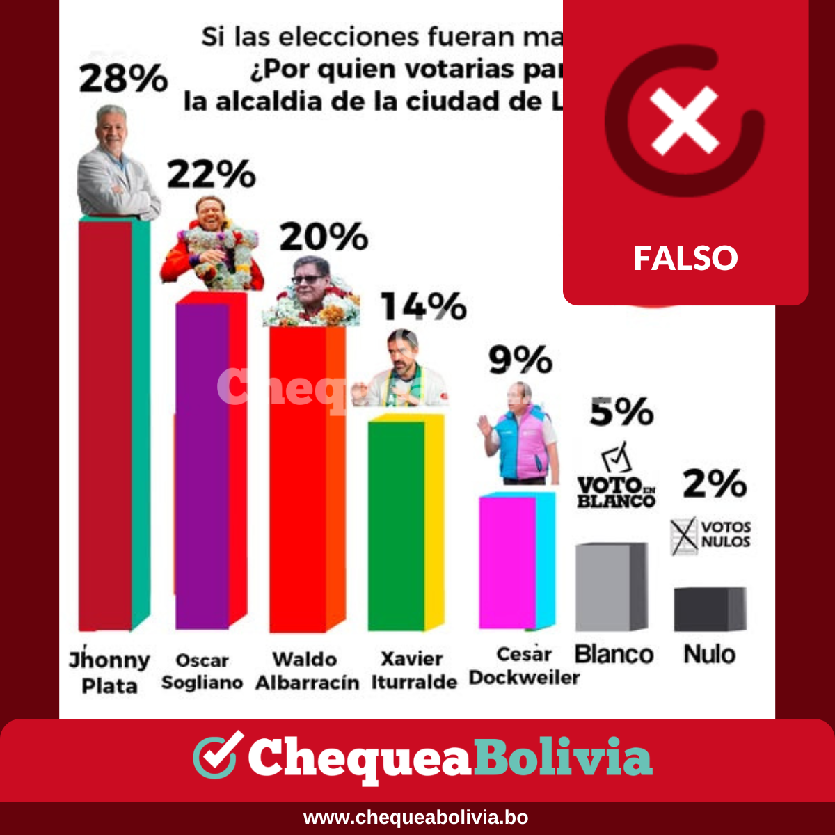 Es falso que existe una encuesta para la Alcaldía de La Paz en la que lidera Jhonny Plata con 28%.