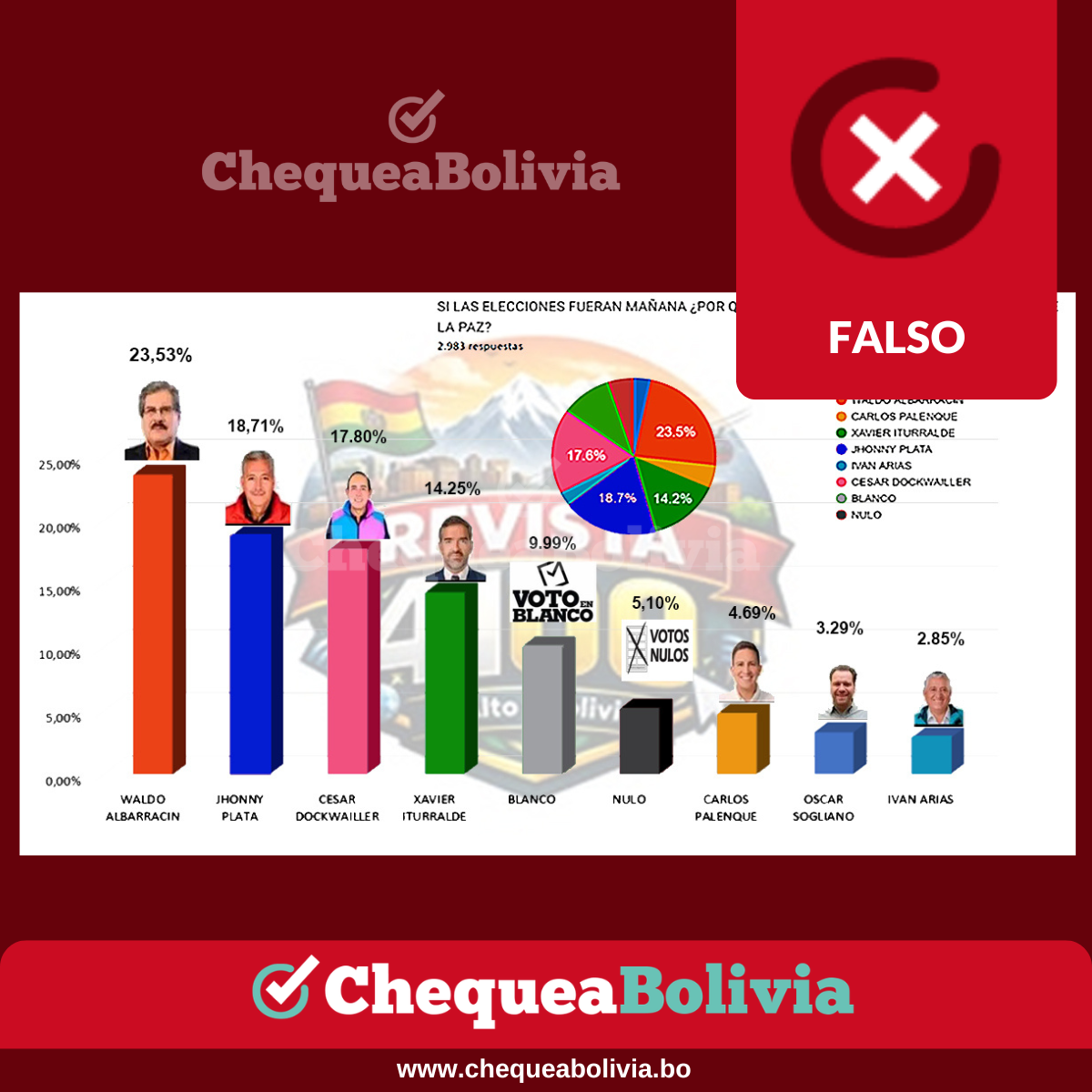 Es falso que Waldo Albarracín lidera la votación con 23% para la Alcaldía de La Paz.