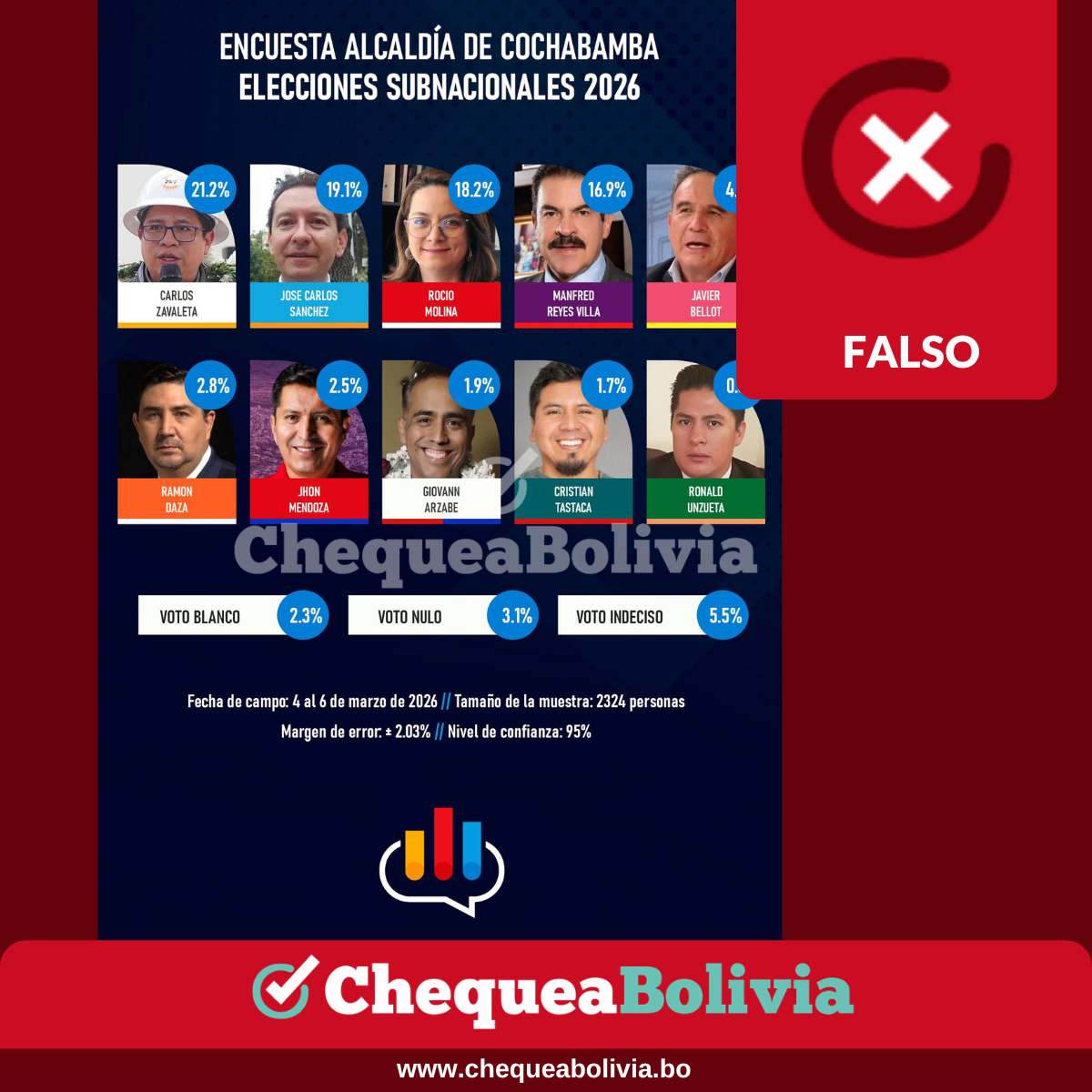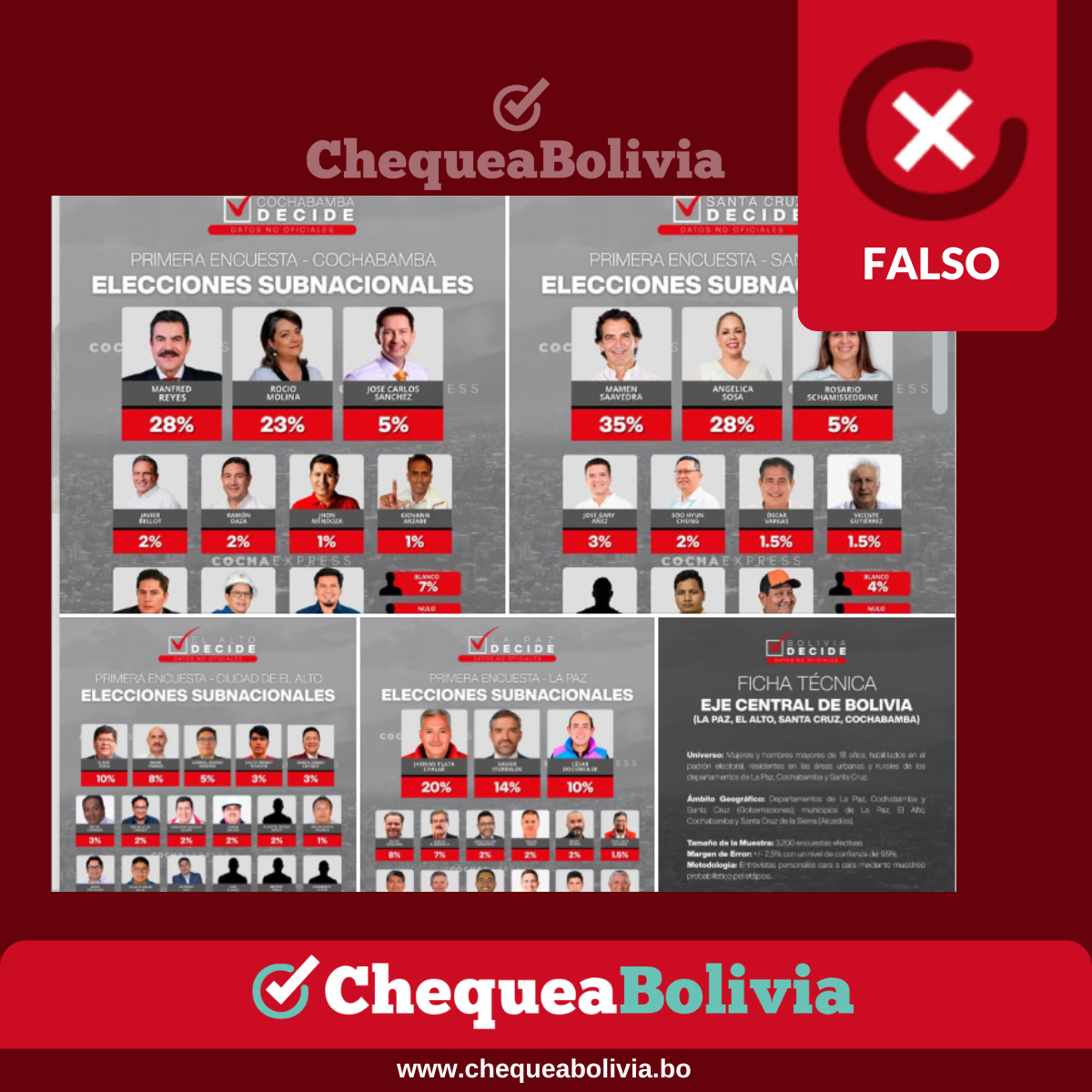 La encuesta de Cocha Express que revela resultados para las alcaldías de La Paz, El Alto, Cochabamba y Santa Cruz es falsa.
