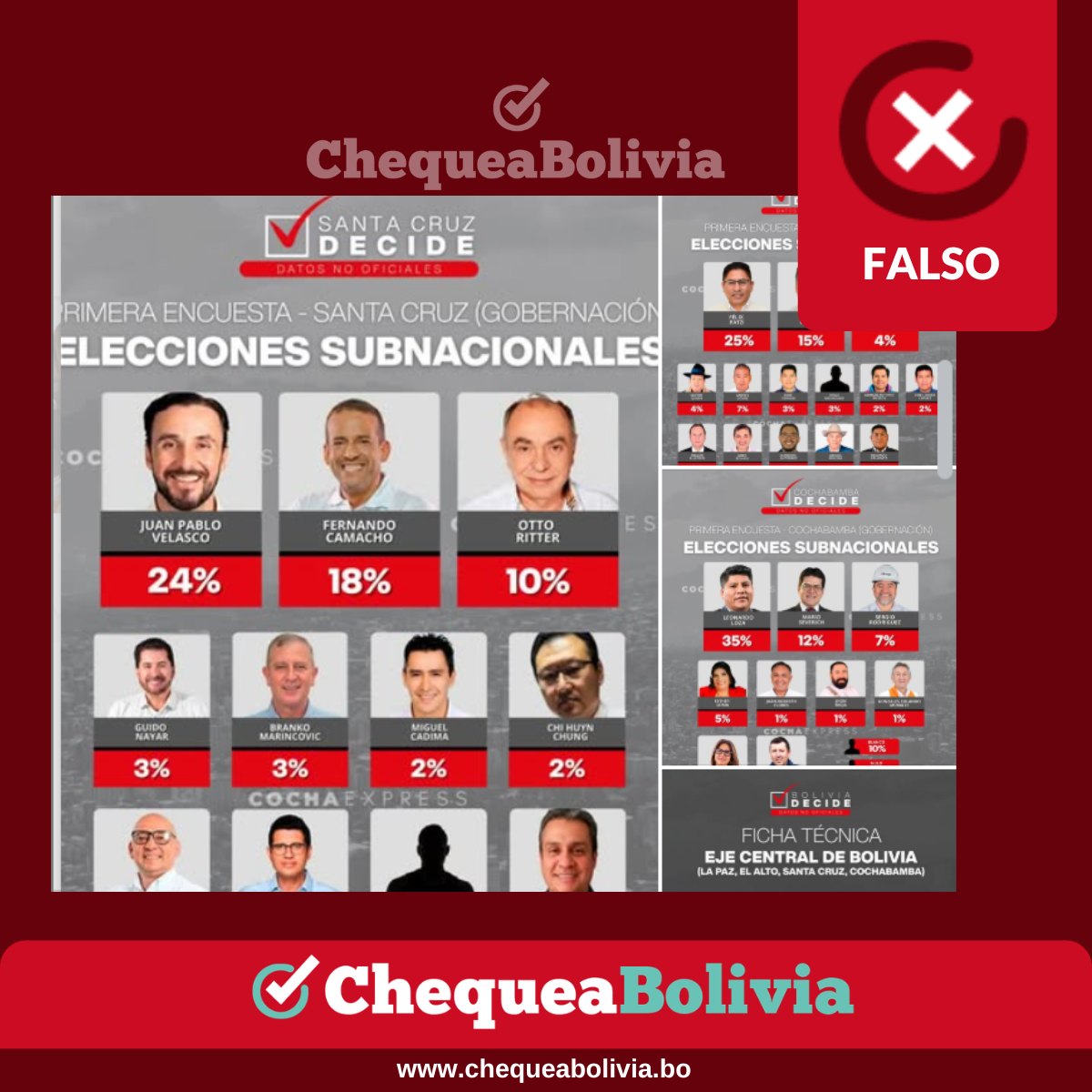 La encuesta de Cocha Express revela resultados para las gobernaciones de La Paz, Cochabamba y Santa Cruz es falsa.
