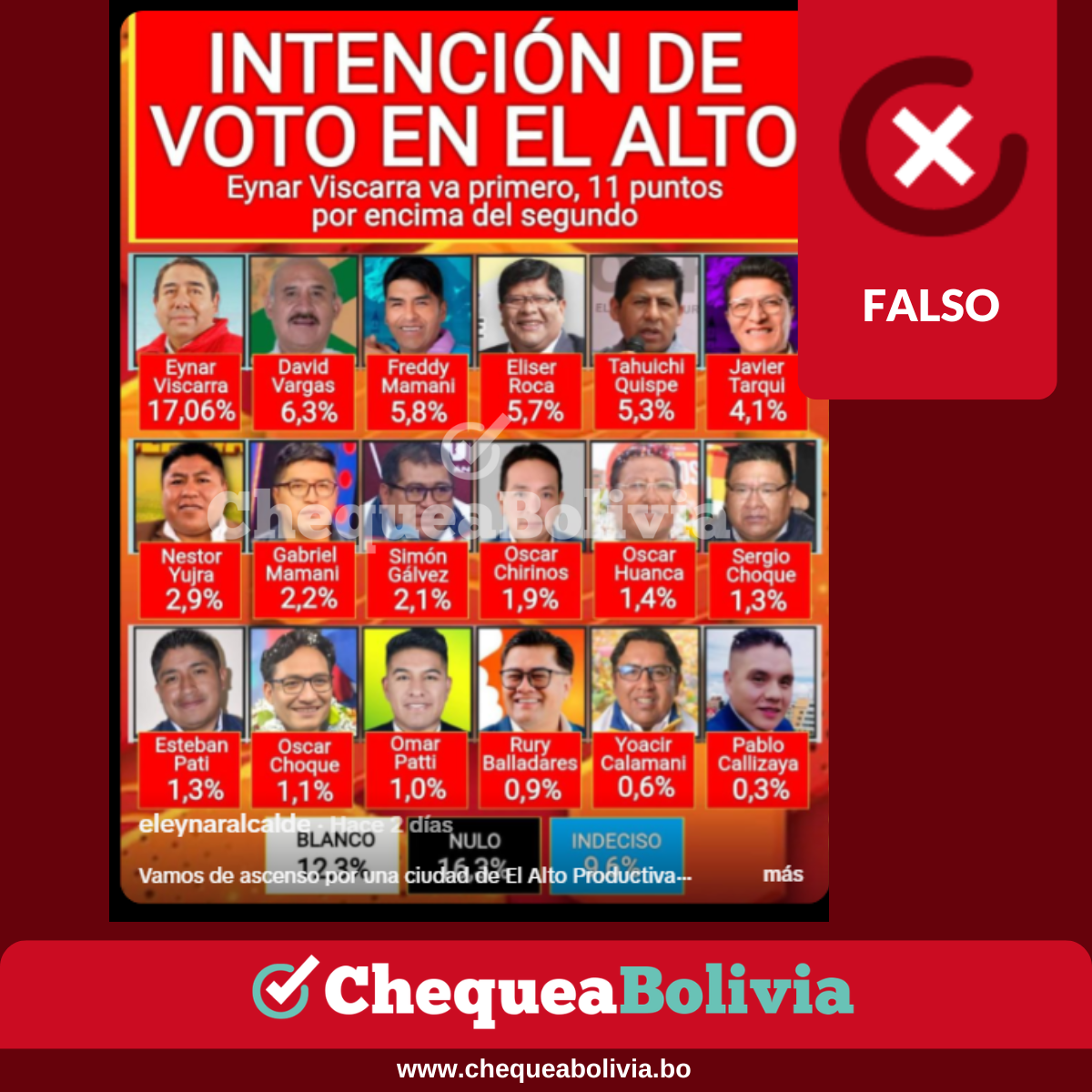 La encuesta que muestra a Eynar Viscarra liderar la intención de voto para la Alcaldía de El Alto con 17% es falsa.