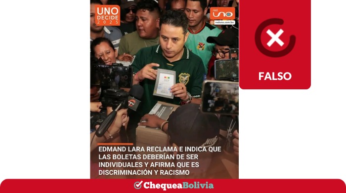 En Facebook se difunde una imagen con los sellos de la Red Uno, en la que se atribuye a Edman Lara una supuesta queja sobre las boletas electorales, afirmando que “deberían ser individuales” y que lo ocurrido sería un acto de “discriminación y racismo”. ChequeaBolivia advierte que se trata de información falsa.
