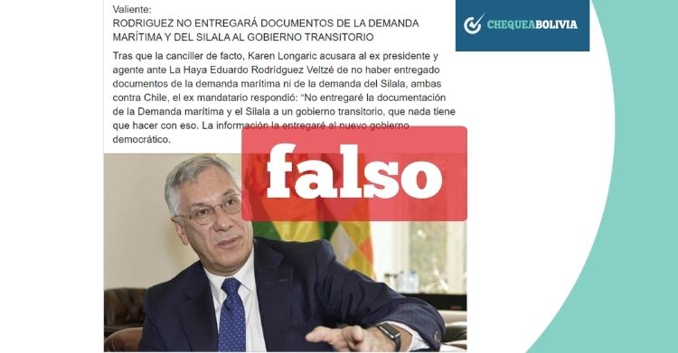 La información falsa circula en redes sociales luego de que la canciller Karen Longaric sostuvo que Rodríguez Veltzé, no entrega documentos de la demanda marítima, cuyo fallo fue adverso al país, y de la defensa de las aguas del Silala, desde noviembre de 2019.