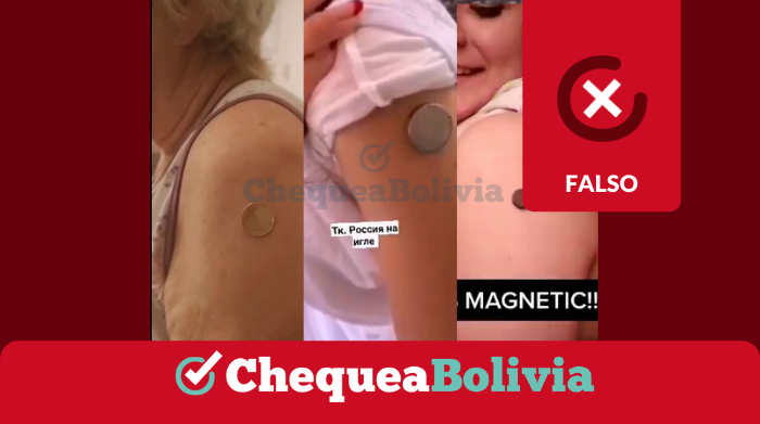 En WhatsApp se reenvía un video que muestra a diferentes personas imanes y monedas que permanecen en los brazos sugiriendo que las vacunas contra el COVID-19 tendrían un efecto magnético. ChequeaBolivia advierte que es información falsa.