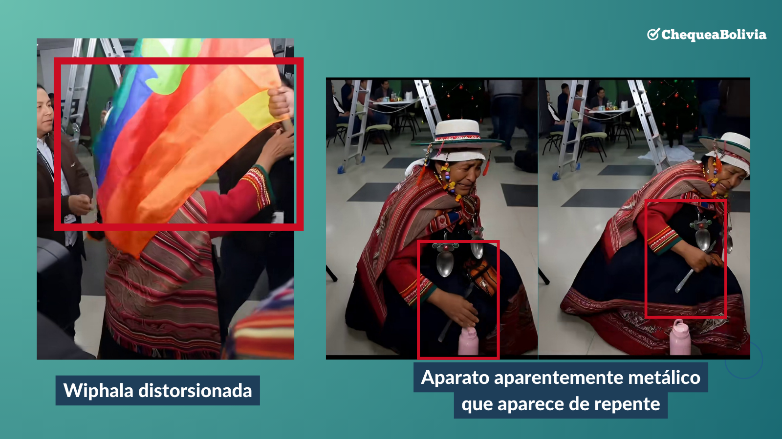 En el video hay detalles que hacen notar que fue generado artificialmente. Por ejemplo, los movimientos y expresiones de las personas son poco naturales. Los colores de la wiphala aparecen distorsionados y no corresponden a los reales. En las manos de Patty aparece de repente un aparato que parece metálico.