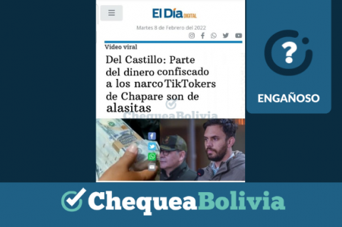 En Facebook se comparte una imagen de una supuesta nota de El Día con una cita textual atribuida al ministro de Gobierno, Eduardo del Castillo: “Parte del dinero confiscado a los narco TikTokers de Chapare son de alasitas. ChequeaBolivia verificó que se trata de información engañosa.