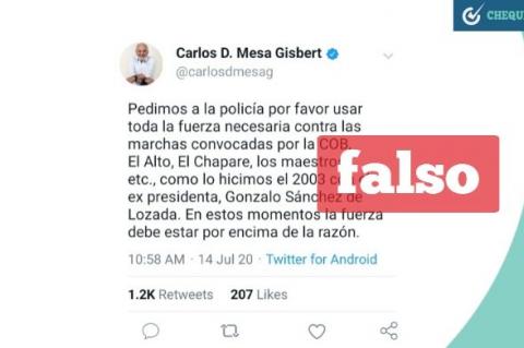 En redes sociales se comparte un supuesto tuit en el que Carlos Mesa, candidato a la presidencia por Comunidad Ciudadana (CC), pide a la policía “usar toda la fuerza necesaria contra las marchas convocadas por la COB”. ChequeaBolivia verificó que la información es falsa.