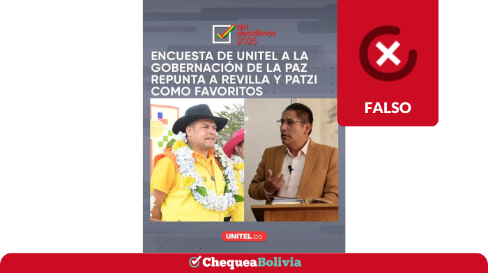 En redes sociales circula una imagen con la línea gráfica de Unitel que tiene el siguiente titular: “Encuesta de Unitel a la Gobernación de La Paz repunta a Revilla y Patzi como favoritos”. ChequeaBolivia advierte que esta información es falsa.