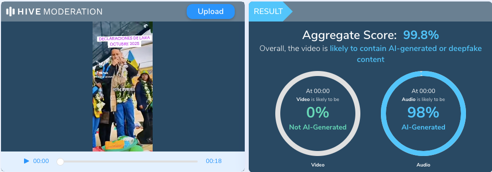 ChequeaBolivia sometió el material audiovisual a las herramientas Hive Moderation y Hiya Deepfake Voice Detector, especializadas en detectar contenido generado por Inteligencia Artificial (IA). El resultado de Hive Moderation arrojó más del 99 por ciento de probabilidad de que el video haya sido generado con IA.